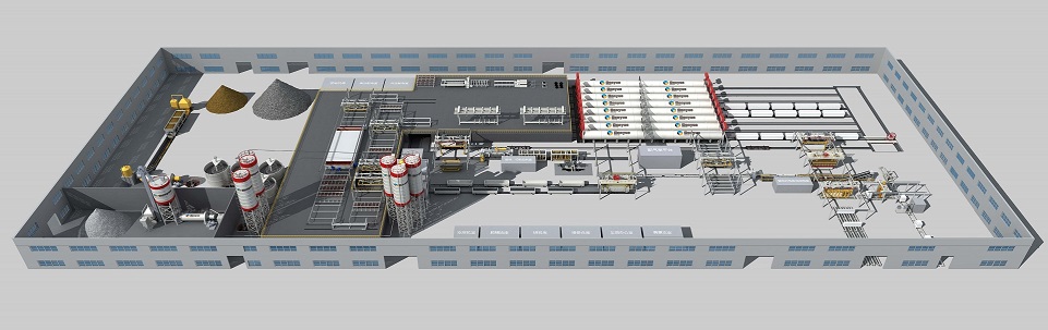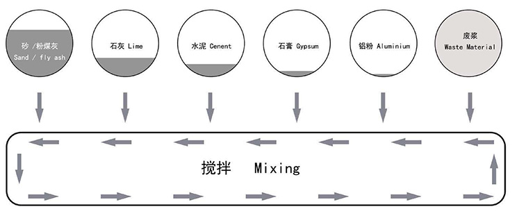 料漿、膠結(jié)料、石膏和鋁粉都分別通過(guò)相應(yīng)自動(dòng)計(jì)量稱計(jì)量,后在攪拌機(jī)內(nèi)高速攪拌,澆注到模箱后進(jìn)行氣泡梳理。整個(gè)體系由 PLC 系統(tǒng)進(jìn)行自動(dòng)控制,保證工序的精確和高效。